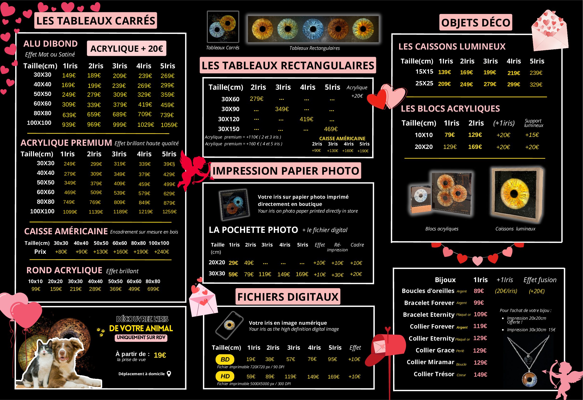 Explorez une gamme complète de services de photographie d’iris, des portraits classiques aux œuvres personnalisées. Venez découvrir nos créations uniques et nos tarifs compétitifs.