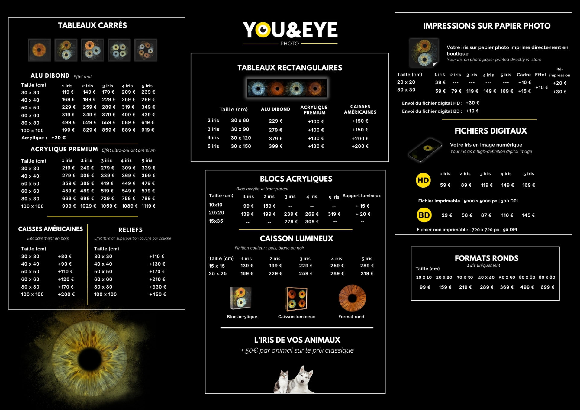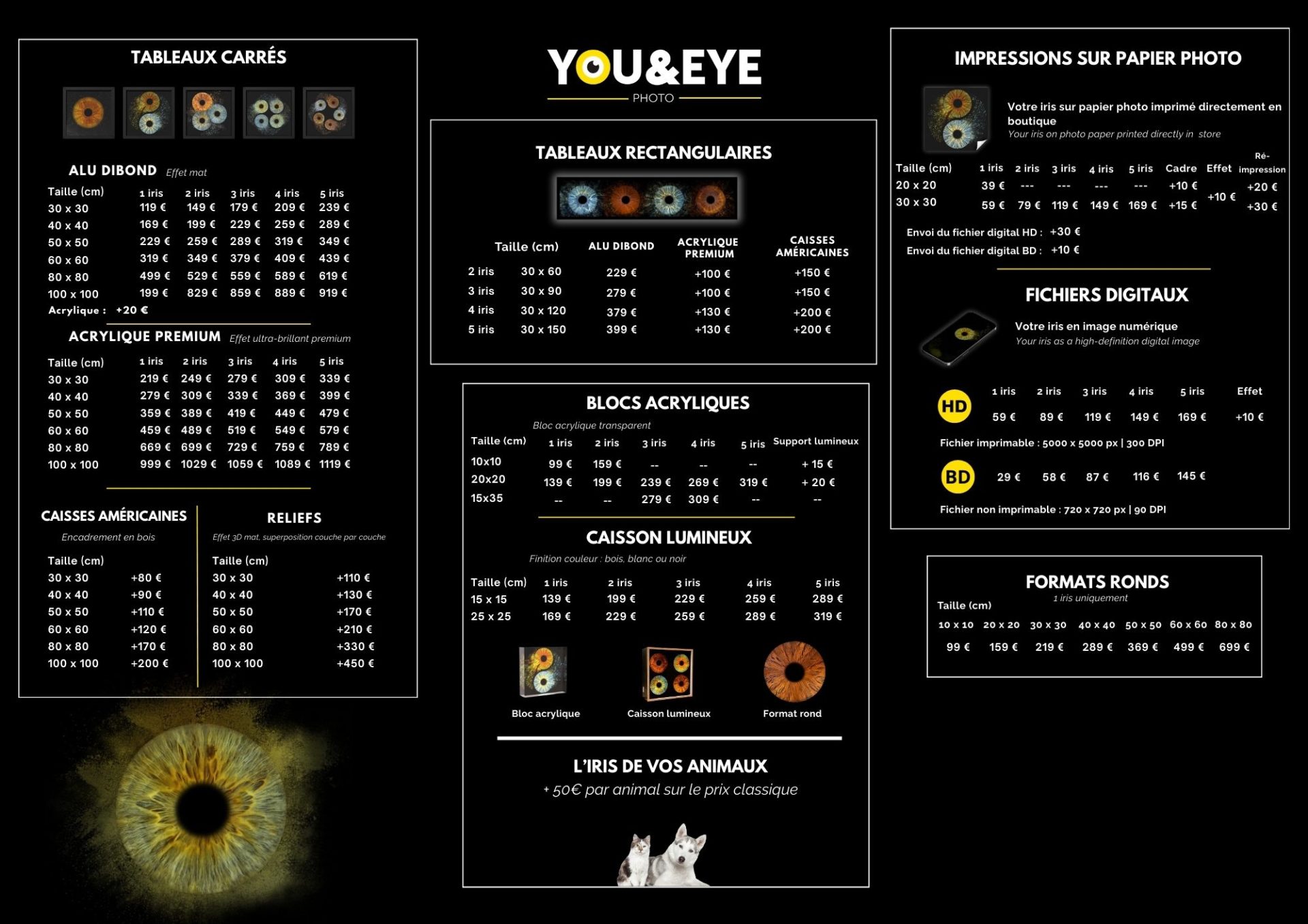Explorez une gamme complète de services de photographie d’iris, des portraits classiques aux œuvres personnalisées. Venez découvrir nos créations uniques et nos tarifs compétitifs.