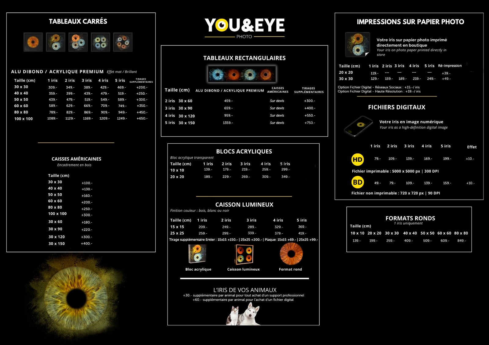 Nous proposons une large sélection de services en photographie d’iris, depuis les portraits simples jusqu’aux œuvres artistiques sur mesure. Découvrez notre expertise et nos offres en visitant notre boutique.